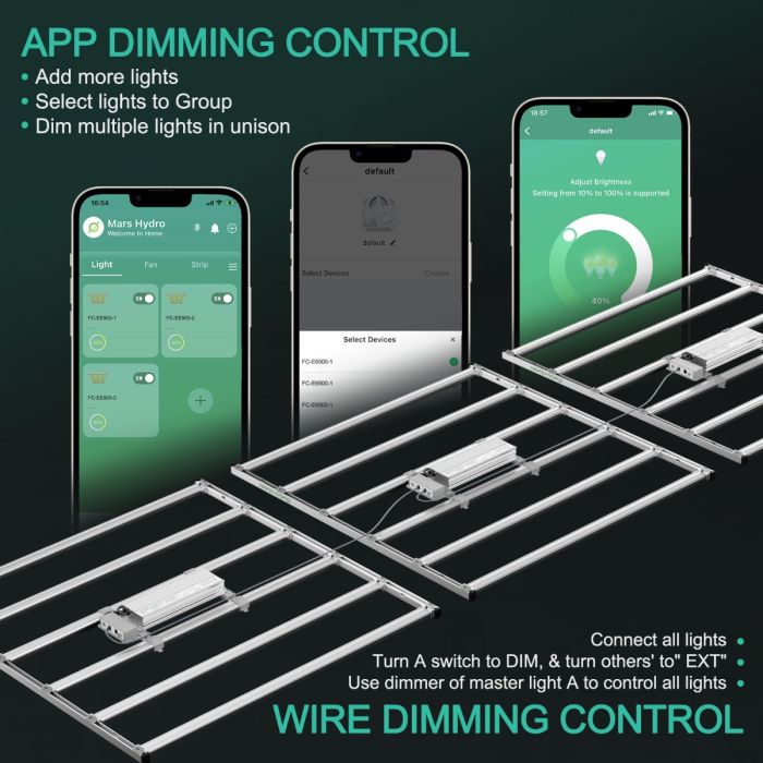 APP-Controlled FC-E6500, member of the Mars Hydro smart grow system, supports mobile control and growth plan programming. Densely mounted with 3546 pcs BridgeLux chips, resulting in an average PPFD of 1200umol/m²/s. Coupled with enhanced red and blue light, the yield is increased by 2.5g/watt, making the FC-E6500 suitable for large commercial cultivation.